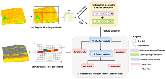 - Combining reflectance statistical and geometric features with a double-layer random forest classifier and incorporating stratigraphic attitude constraints (i.e., SG-RFGeo).