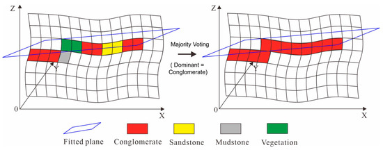 - Geology-constrained post-classification correction algorithm: A stratigraphic boundary-guided refinement strategy is proposed, incorporating geological prior knowledge—specifically, the stratigraphic principle of lateral continuity, which posits that lithologies within the same sedimentary layer tend to exhibit lateral consistency and internal homogeneity. By fitting stratigraphic surfaces and applying majority voting within each delineated layer, the method effectively reduces misclassifications caused by surface weathering or sensor-induced noise. This post-processing step significantly improves both the spatial continuity and geological plausibility of the classification results.