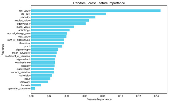 - Extracting a multidimensional feature set, including spectral features (e.g., reflectance median, mean, skewness) and geometric features (e.g., curvature, planarity, sphericity);