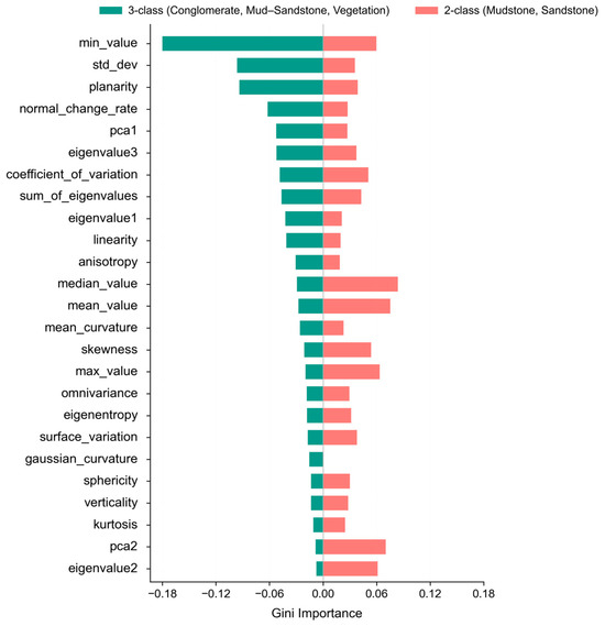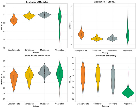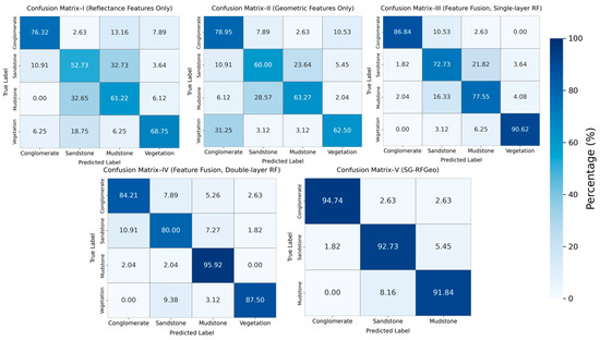 - Grid-based multi-source feature fusion method: A systematic framework was developed for feature extraction from gridded point cloud units, enabling the simultaneous acquisition of spectral reflectance statistics (e.g., median, kurtosis) and 3D geometric descriptors (e.g., surface variation, curvature, planarity). This method supports a comprehensive, multidimensional characterization of outcrop point cloud attributes, providing a strong foundation for robust lithological classification.
