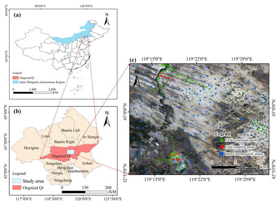 (a) Location of Ongniud Qi and Inner Mongolia Autonomous Region, China; (b) location of the study area in Ongniud; (c) spatial distribution of selected sampling points. The bottom image is the true color image of Gaofen 5B (blue: 459.7 nm, green: 549.5 nm, red: 660.7 nm).