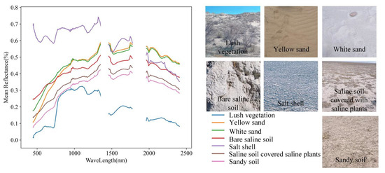 Figure 2 shows the average spectra of seven land cover types on the left and the corresponding field photographs on the right. Among these, the spectra of lush vegetation and salt shell differ significantly from the other five categories, while the remaining five categories exhibit distinct soil spectral characteristics, with visible light and near-infrared reflectance increasing gradually with wavelength. And the reflectance changes are relatively uniform across all bands, with no extreme peaks or troughs. White sand has a significantly higher reflectance than yellow sand in the visible light band, while the differences in other bands are not significant. In overall terms, the reflectance is as follows: salt shell > white sand > yellow sand > bare saline soil > saline soil covered with saline vegetation > sandy soil > lush vegetation.