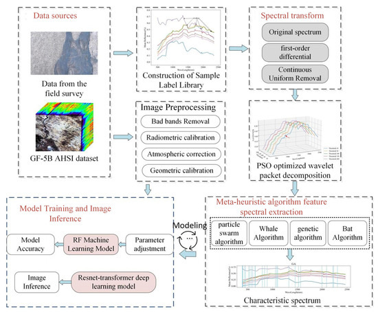 The structure of our study is shown in the flowchart in Figure 3 and consists of the following three main steps: (1) The PSO was used to find the globally optimal decomposition levels, decomposition thresholds, and wavelet basis function for wavelet packet decomposition to remove noise from spectral curves. (2) Four metaheuristic optimization algorithms were applied, including Genetic Algorithm, Bat Algorithm (BA), Differential Evolution (DE), and Particle Swarm Optimization, to extract desertification features and remove spectral redundancies from the original spectra (OS), first-order differential spectra, and continuum-removed spectra (CR). (3) In the comparison of traditional Random Forest models with the ResNet-Transformer model, the most suitable classification model was selected for accurately extracting soil desertification and salinization areas. These approaches aim to advance the precision and efficacy of soil desertification extraction methods, contributing to the sustainable management and utilization of soil resources.