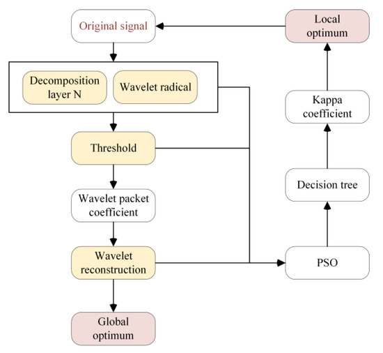 To address the issues of selecting the appropriate threshold parameter, wavelet basis function, and decomposition level, the PSO-based optimization method for globally optimal wavelet packet selection is adopted, as illustrated in Figure 4.
