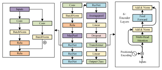 Convolutional Neural network exploding may suffer from gradient exploding. To address these challenges, He et al. introduced Residual Networks (ResNet) in 2015 [31], employing a residual learning framework to optimize the training of deep networks. Central to ResNet is the concept of residual learning. Traditional convolutional networks stack multiple layers, each expected to learn mappings from inputs to outputs. Transformer models were originally introduced in the field of natural language processing (NLP), featuring a core mechanism known as self-attention. This mechanism enables the model to focus on other words in the input sequence when computing the representation of each word, thus capturing long-range dependencies. In the context of hyperspectral image classification, Transformer’s attention mechanism can assist the model in better understanding contextual information within the spectra. Inspired by the Transformer architecture’s impact on NLP, we conceptualize each pixel as serialized information, transforming visual tasks into NLP-like problems. In our network, the ResNet model was applied to capture local patterns and features, while employing Transformer to handle long-range dependencies, thereby harnessing the strengths of both approaches effectively. The network architecture used in this study is illustrated in Figure 5. Table 3 details the specific hyperparameter settings used in the ResNet training.