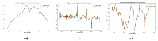 Comparison of OS, FD, and CR spectra of saline soil before and after wavelet packet denoising. The red line represents the spectra without denoising, while the green line represents the spectra after wavelet packet denoising. (a) Original Spectrum (OS). (b) First-Order Derivative Spectrum (FD). (c) Continuum Removed Spectrum (CR).