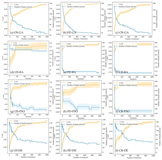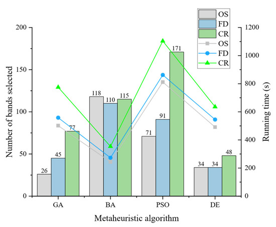 The results indicate that the ranking of the fitness for selecting bands from the original spectrum by the four metaheuristic algorithms is as follows: GA > DE > BA > PSO for OS, GA > DE > PSO > BA for FD, and DE > GA > BA > PSO for CR.