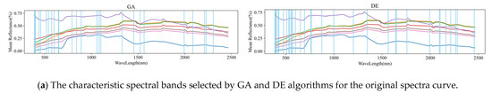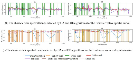 Figure 9 is a schematic diagram showing the locations of the selected characteristic bands and the averaged spectral curves of the land cover for the GA and DE algorithms applied to the OS, FD, and CR spectra. In the figure, for the original spectrum (Figure 9a), both GA and DE selected a large number of bands in the 380–780 nm visible light range. Among these, 46.2% of the visible light bands selected by GA account for the total number of bands, while 66.7% of the visible light bands selected by DE account for the total number of bands. This is because land covers such as vegetation, saline areas, sandy land, and salt crusts exhibit different colors and brightness in the visible light range, making it easier to distinguish them [46]. Additionally, many shortwave infrared bands in the 1950–2300 nm range were also selected. This is similar to the findings of Chapman [47], who used shortwave infrared bands for salt flat identification, and Drake [48], who studied salt absorption peaks in evaporative minerals using SWIR bands, indicating that shortwave infrared bands are characteristic for identifying saline and alkaline areas.