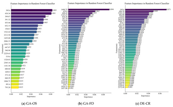 Based on the analysis of the results in Figure 9, the optimal feature selection algorithm for the OS and FD is the GA, while for the CR spectrum, the optimal feature selection algorithm is the DE algorithm. The feature bands selected by the optimal feature selection algorithms for the three spectra were evaluated based on the Gini importance score in Random Forest to measure their contribution to the prediction results. In different spectral transformations, features may be either amplified or compressed, leading to changes in the selected feature band locations and their importance. For the OS spectrum features (Figure 10a), the top six most important bands are in the visible range, accounting for 41.9% of the total importance, followed by six shortwave infrared bands, which contribute 27.7% to the total importance. The three selected near-infrared bands account for only 4.7%, consistent with the previous analysis. For the first-order differential spectrum (Figure 10b), the selected 1488.75 nm band accounts for 9.4% of the total importance, and the 2145.25 nm band accounts for 5%. As shown in Figure 9 of the mean spectral curves for land covers, these two bands exhibit distinct separation boundaries for the six land cover types, which are not apparent in the original spectrum. For the CR-transformed spectrum (Figure 10c), the most important feature is also the 395.6 nm band, with other important bands concentrated around the absorption or reflection peak regions.