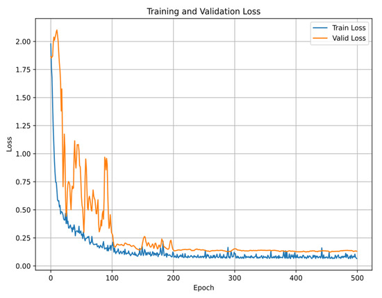 Figure 11 shows the changes in training and validation loss during the training process of the WP-GA-FD-ResNet-Transformer model. From the figure, it can be observed that during the early stages of training, due to the high initial learning rate, the training and validation losses decrease rapidly. However, as training progresses to approximately 100 iterations, both the training and validation losses begin to stabilize around 0.15. As the number of iterations increases, the losses for both the training and validation sets level off, and they become very close to each other. This indicates that the ResNet-Transformer model effectively avoids overfitting.
