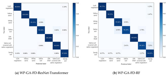 Figure 12 shows a comparative analysis of the FD-ResNet-Transformer and FD-RF models after wavelet packet noise removal and GA-based feature band selection. From the results, it can be observed that both models perform well in identifying land covers with significant spectral differences, such as dense vegetation, yellow sand, salt crust, and sandy soil, with minimal confusion with other land covers. However, when dealing with land covers that have small spectral differences, such as white sand, saline–alkali soil, and saline–alkali soil covered with saline vegetation, the ResNet-Transformer model maintains better performance, whereas the traditional RF model tends to experience confusion. Only 90.28% prediction accuracy was achieved for features like saline soil, while 95.5% prediction accuracy was achieved for the ResNet-Transformer. This may be because the ResNet-Transformer network, when extracting features from land covers with small spectral differences, leverages the convolutional structure to capture local information and the Transformer’s self-attention mechanism to establish long-range dependencies, thereby capturing both spectral shape features and subtle spectral differences.