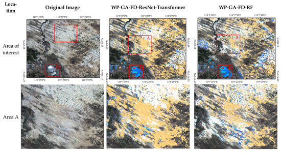 Comparison of extracted images using the WP-GA-FD-Resnet Transformer and the WP-GA-FD-RF for areas A and B.