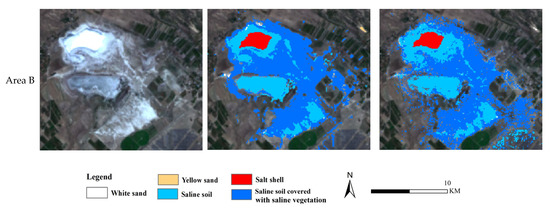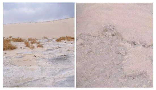 Based on the statistical results from Figure 14 on the distribution of saline land, the total area of saline land in Ongniud Qi is approximately 128.25 square kilometers, including 0.48 square kilometers of salt crust, 5.83 square kilometers of exposed saline–alkali land, and 121.94 square kilometers of saline land covered with saline plants. Saline soil is mainly distributed around seasonal lakes, rivers, and some low-lying areas. For example, the seasonal lake Qigan Noer in Wudan Town, located in the Qigan Dapaozi area, experiences increased precipitation in the summer. Due to the surrounding higher terrain, water-soluble salts are carried by water from higher elevations to lower areas. After the rainy season, the dissolved salts accumulate on the surface of the soil once the moisture evaporates. At the Qigan Dapaozi lake, the surface vegetation changes progressively from saline–alkali land covered by saline plants to exposed saline–alkali land, and finally to large patches of exposed salt crust as one moves toward the center of the lake. The degree of salinization increases as one move inward toward the center. Samples collected from the low-lying area at the center of the lake were analyzed using the X-ray diffraction (XRD) of minerals. The results showed that the salt content of halite (rock salt) was 32%, with the contents of water-soluble salts and natural soda ash at 8% and 14%, respectively.