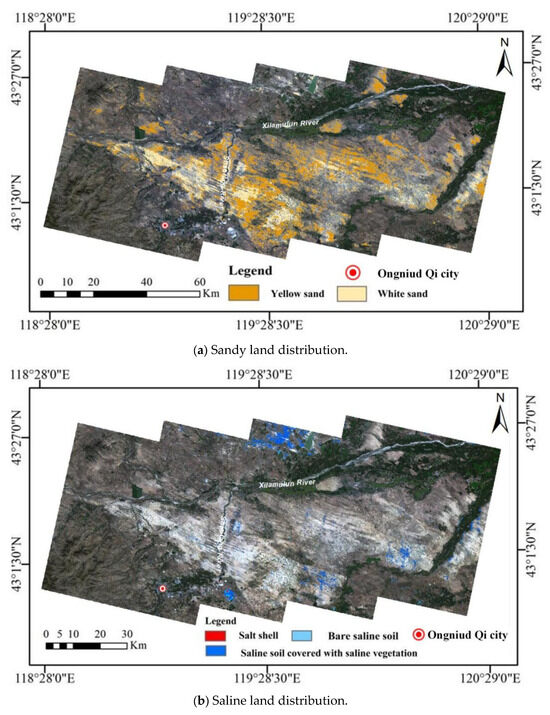 Predicted distribution of sandy and saline land in Ongniud Qi.