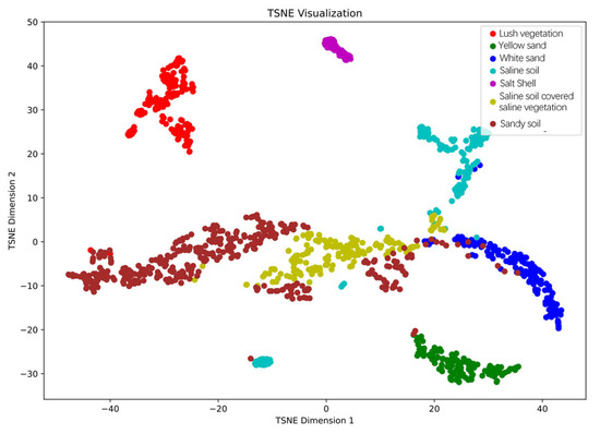 Many studies have shown that factors such as salt type, soil mineralogy, moisture content, organic matter content, color and brightness, roughness, and vegetation coverage significantly influence the spectra of soils. However, when only visible and near-infrared wavelengths are considered, soil salinity levels have a limited impact on the spectral response within this range. In particular, white sand and saline–alkali soils exhibit a high degree of spectral similarity in the visible wavelength range [50]. To investigate the reasons for the confusion between saline soils (with withered vegetation) and white sand (with withered vegetation), we employed t-distributed stochastic neighbor embedding (t-SNE) to calculate the similarity between each pair of points in the high-dimensional data. The visualization of sample spectra in high-dimensional space was mapped to two dimensions, as shown in the t-SNE plot (Figure 15), where the four sample types overlap, indicating high spectral similarity and making them prone to confusion during modeling and identification. As illustrated in Figure 16, in the transition zone between white sand and vegetation, small natural water depressions often form along the edges of sand dunes during rainfall. The fine minerals weathered in the sand accumulate and clayify under the action of water flow. Consequently, the complexity of the accumulated components and the texture in this region creates difficulties in spectral extraction.