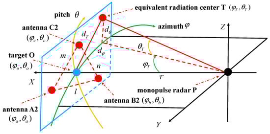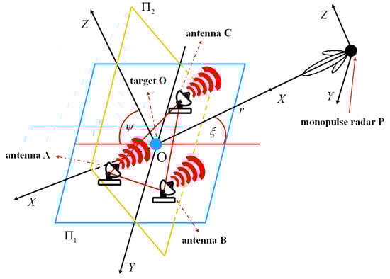 First, the spatial geometric configuration of the triplet antenna and the target is determined [39], as shown in Figure 1. Without loss of generality, monopulse radar P is used as the origin of the coordinate system, and line OP between radar P and target O is defined as the X-axis. In the plane of the triplet antenna and the target, the vertical line of the OP is taken as the Y axis, and the direction of the Z axis is further determined according to the right-hand rule. The angle between the line OP and the target plane is denoted as . The triplet antenna A, B, and C form a triangular layout, and their spatial coordinates are expressed as , , and . The coordinates of the target are defined as .