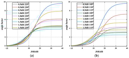 The relationship between the angle factor of the triple and JSR under different parameters: (a) = 0.5 dB and = 115°; (b) = 0.5 dB and = 115°.