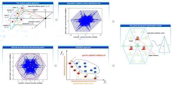 The remainder of this paper is organized as follows. Section 2 first determines the spatial geometry of the triplet antenna and target, and then derives the distribution law of the equivalent radiation center of the triplet antenna under the condition of the target echo. Subsequently, a joint optimization model of jamming power and array is constructed, and the NSCWOA algorithm is introduced. In Section 3, the simulation results are presented, and the optimal arrays in omnidirectional and non-omnidirectional situations are obtained. In Section 4, the proposed algorithm is compared with five classical algorithms to verify its effectiveness of the proposed algorithm. Finally, this paper is summarized in Section 5.