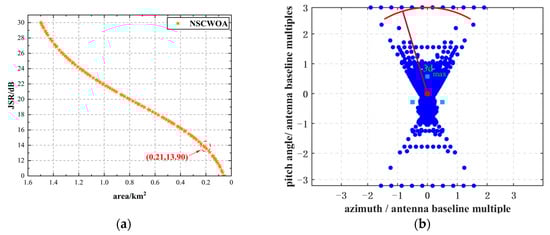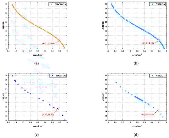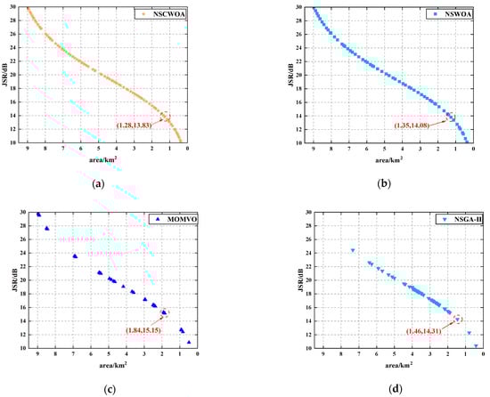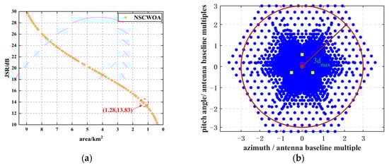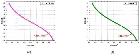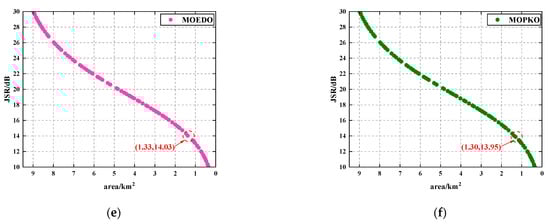 From the perspective of triple parameter tolerance, this section finally chooses the relationship curve of = 0.5 dB, = 115°, = 0.5 dB, = 235° as the optimization basis. The NSCWOA algorithm is then used to solve the mathematical model in Equation (14). Through algorithm optimization, the relationship curve between the JSR and control area in the omnidirectional case is obtained, as shown in Figure 7a. It can be seen that as the JSR decreases, the protected area gradually reduces, indicating the contradictory relationship between the two.