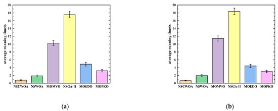In this section, the average running time and its standard deviation are used to evaluate the convergence speed of each algorithm. The detailed comparison results of the average running time are shown in Figure 12, and the specific experimental data are shown in Table 2. The simulation experiment uses the Windows 11 (64 bit) operating system. The hardware platform parameters are as follows: Intel (R) Core (TM) i9-13900 K CPU, 3.00 GHz main frequency, and 16 GB memory. The computing environment is MATLAB R2024 a.