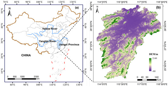 Geographical location of study area. (a) map of China; (b) DEM of Jiangxi province.