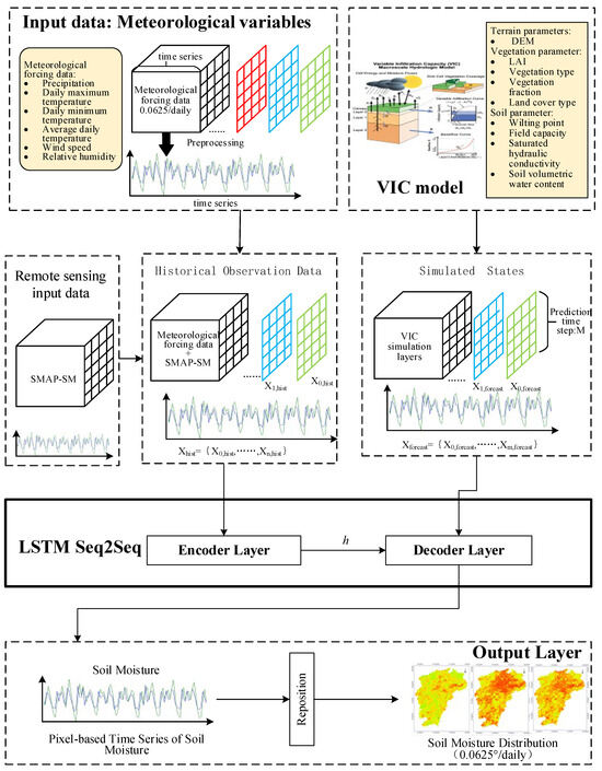 Data from 1 January 2016 to 31 December 2022 were selected. To prevent data leakage, the first 60% is used for model training, followed by 20% for validation, and the remaining 20% for testing. That is, the data from 2016 to March 2020, approximately, were used for training, the data from March 2020 to August 2021 were used for validation, and the data from August 2021 to December 2022 were not used for training but used to test the performance of the model. The time range of the SMAP also spanned 2016–2022. We preprocessed the collected datasets to ensure data quality, removing missing and outlier values. The target variable retained its original units, and the SMAP data were resampled to match the 0.0625 resolution of the VIC model output. The validation set was used to tune the model’s hyperparameters. Given the temporal nature of the data, the dataset was split chronologically to prevent data leakage, ensuring that the training set always preceded the validation set. The testing set was employed to assess the model’s performance on unseen data. This structure ensured the model’s robustness and generalizability, enabling it to effectively handle real-world scenarios. The model framework is illustrated in Figure 3.