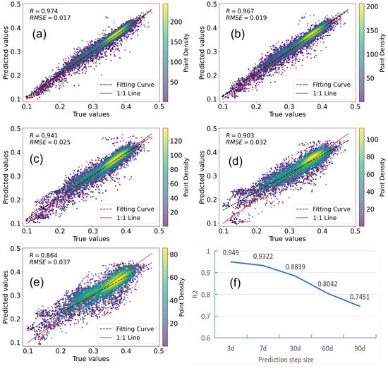 Scatter plots and step length–accuracy response curves for SM predictions. (a–e) Scatter plots of SM predictions by the LSTMseq2seq model for 3-day, 7-day, 30-day, 60-day, and 90-day time steps. (f) Step length–accuracy response curve for SM predictions by the LSTMseq2seq model.