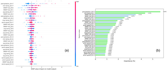 To systematically evaluate the relative importance of different time scales and feature types in the SM prediction model, this study employed the SHAP feature importance analysis method. We quantitatively analyzed the impacts of 30-day historical meteorological factors and SM (from t0 − 29 to t0), as well as future meteorological data and VIC-simulated differences in SM between the FLSWC and SLSWC for the subsequent 7 days (from t0 + 1 to t0 + 7), on the model’s prediction accuracy. The results are presented in Figure 5. The findings reveal a significant “recency effect” across the entire time dimension in the time sensitivity analysis. Specifically, precipitation on day 7 (precipitation_t0 + 7, accounting for 5.66%) and the minimum air temperature on day 7 (min_temp_t0 + 7, accounting for 4.34%) exhibit the most prominent contributions to the model. Meanwhile, the importance of historical features decreases with time, while the observed historical SM status demonstrates considerable predictive value. The contribution of same-day precipitation (5.66%) to SM likely reflects its direct driving effect on abrupt changes in SM. As the primary input source of SM, precipitation particularly influences surface soil, with its impact typically manifesting on hourly to daily scales. The same-day minimum air temperature may indirectly regulate SM by affecting evapotranspiration or vegetation water use efficiency—for instance, low temperatures suppress evaporation, prolonging SM retention time.