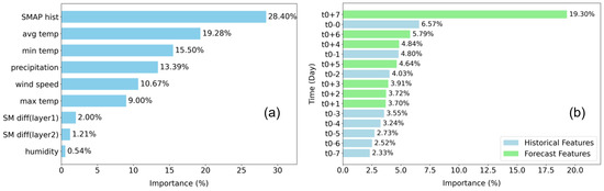 In the feature contribution analysis without considering temporal factors (Figure 6a), historical SM features dominated (SMAP hist, accounting for 28.4%), followed by meteorological factors such as average air temperature (avg temp, 19.28%), observed minimum temperature (min temp, 15.5%), and precipitation (precipitation, 13.39%). The importance of past SM features (28.4%) far exceeds that of meteorological factors (e.g., air temperature, precipitation), possibly due to the following: (1) the memory effect of SM, where changes exhibit hysteresis and the current state is the result of cumulative past meteorological conditions; (2) nonlinear hydrological responses, where SM changes are influenced by the complex interactions of the soil–vegetation–atmosphere continuum; (3) the impact of vertical heterogeneity, where SM at great depths changes slowly but affects surface moisture through upward replenishment.