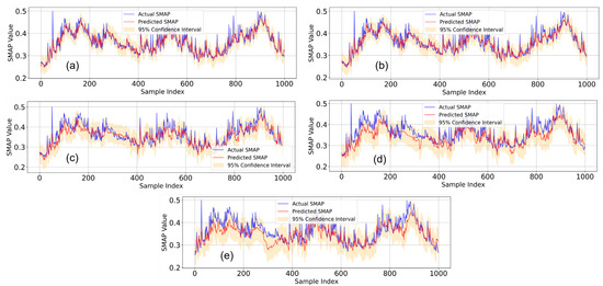 Figure 7 presents a comparison between the actual SM values and the predicted values for the first 1000 validation samples, along with the uncertainty range of the 95% confidence interval predictions. The majority of the data points fall within the 95% confidence interval, indicating that the model’s predictions are well calibrated and reliable.