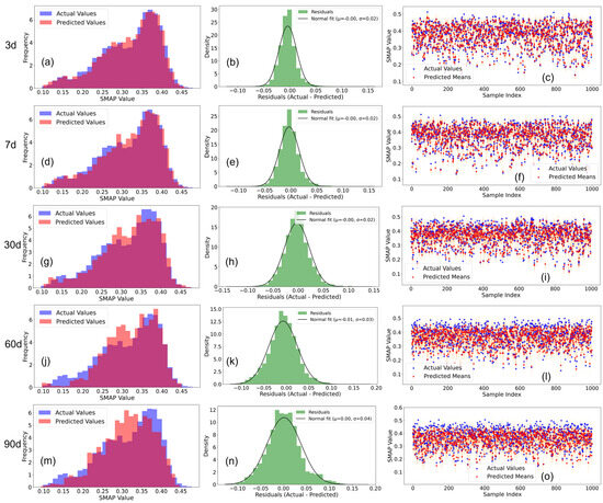 Probability distribution of simulation results from the VIC-LSTMseq2seq model. (a–c) Frequency distribution of predicted and actual SM, distribution of residuals, and visualization of probability distributions for the 3 future day, respectively; (d–f) frequency distribution of predicted and actual SM, distribution of residuals, and visualization of probability distributions for the 7 future day, respectively; (g–i) frequency distribution of predicted and actual SM, distribution of residuals, and visualization of probability distributions for the 30 future day, respectively; (j–l) frequency distribution of predicted and actual SM, distribution of residuals, and visualization of probability distributions for the 60 future day, respectively; (m–o) frequency distribution of predicted and actual SM, distribution of residuals, and visualization of probability distributions for the 90 future day, respectively.