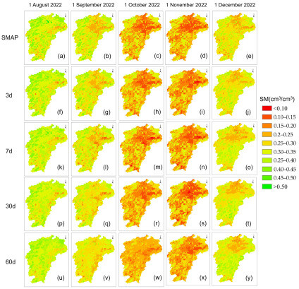 Comparison of SM simulations by LSTM seq2seq and SMAP observations across multiple time steps. (a–e) SMAP SM on 1 August, 1 September, 1 October, 1 November, and 1 December 2022; (f–j) LSTM seq2seq-predicted SM for the 3 future day; (k–o) LSTM seq2seq-predicted SM for the 7 future day; (p–t) LSTM-seq2seq predicted SM for the 30 future day; (u–y) LSTM seq2seq-predicted SM for the 60 future day.