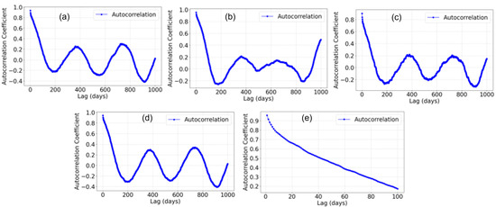 Autocorrelation curves of SM at different sites. (a) Autocorrelation curve of SM at Site 1; (b) autocorrelation curve of SM at Site 2; (c) autocorrelation curve of SM at Site 3; (d) autocorrelation curve of SM at Site 4; (e) autocorrelation curve of SM for all sites (lag time 0–100 days).