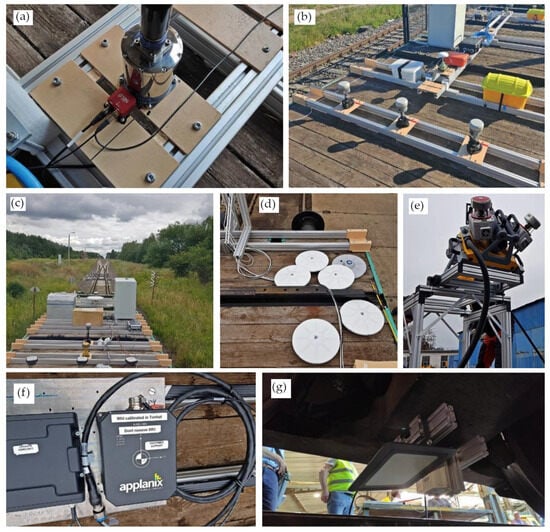 Railway track axis measurements using mobile GNSS (b–d), INS (a,f), TLS (e), and photogrammetry (g) techniques.