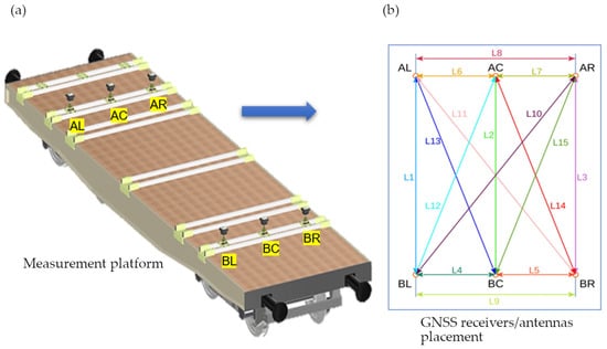 To evaluate the potential for uncertainty reduction and reliability enhancement in a mobile railway track axis positioning system, a six-antenna, multi-receiver configuration was implemented on the measurement platform. Two primary antennas were mounted directly above the bogie pivot points, while four auxiliary antennas were arranged at known offsets to form a rectangular array (Figure 2). Synchronous GNSS measurements from this array of six receivers, each with precisely surveyed horizontal offsets, provide redundant observations that improve the accuracy of the pivot-point antenna positions.