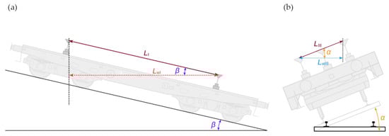 Apparent reduction in distances between GNSS receivers due to the inclination of the measuring platform: (a) angle α resulting from the longitudinal inclination of the track, (b) angle β resulting from the transverse inclination of the track.