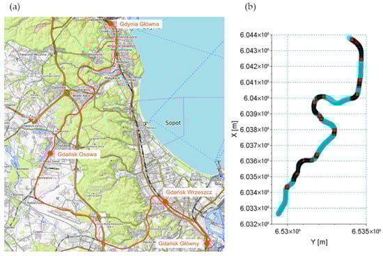 The selected route features complex geometry in both plan and longitudinal profiles, with numerous terrain obstructions that impede satellite signal reception. The urban segment from Gdańsk Główny to Gdańsk Wrzeszcz traverses a densely built environment, punctuated by viaducts and other infrastructural barriers. In contrast, the stretch from Gdańsk Wrzeszcz through Gdańsk Osowa to Gdynia Główna resembles a mountainous line, with tight curves and steep longitudinal gradients. Much of this section runs through forested areas and deep cuttings, and is intersected by footbridges, bridges, and similar obstacles. These conditions reduce satellite visibility and challenge GNSS-based measurements, making the route an ideal testbed for validating the proposed method’s robustness.