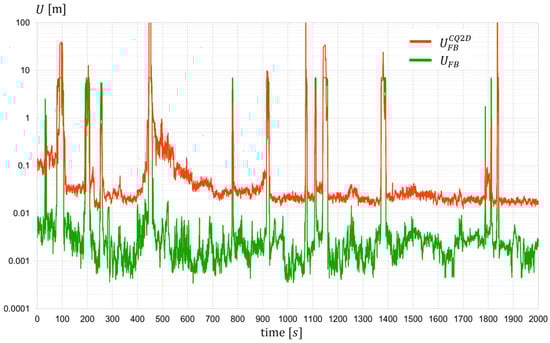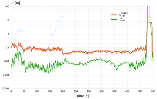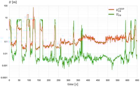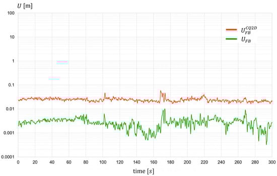 The expanded uncertainty values of the fixed base, UFBUFB, calculated using the proposed algorithm, were evaluated using Formulas (41) and (53), assuming . Using the above computational methodology, Figure 7, Figure 8, Figure 9, Figure 10 and Figure 11 present the compared expanded uncertainties, illustrating the effectiveness of the method along the analyzed track section. The horizontal axis of the plots represents time. For the purposes of computation, analysis, and clear presentation of the results, the entire route was divided into five sessions.
