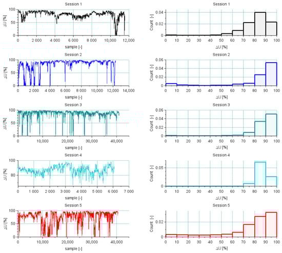 The analysis of the results presented in Figure 7, Figure 8, Figure 9, Figure 10 and Figure 11 allows us to draw conclusions regarding the effectiveness of the developed algorithm. In the majority of cases, i.e., where the algorithm successfully determines the fixed base length, the reduction in expanded uncertainty is clear, amounting to approximately an order of magnitude compared to the original values. In instances where determining is not feasible due to insufficient reliable input data, the uncertainty comparisons are not meaningful. Including these instances in the plots (Figure 7, Figure 8, Figure 9, Figure 10 and Figure 11) highlights the number of track sections for which coordinates must be supplemented or replaced by data from alternative systems, such as INS. To further illustrate the algorithm’s performance, Figure 12 presents plots depicting the percentage reduction in expanded uncertainty alongside a histogram illustrating the distribution of these values—including sections that have been deemed unreliable due to low parameter values. The evaluation of these plots confirms the high efficacy of the proposed method. Numerical summaries of key statistics are provided in Table 2.