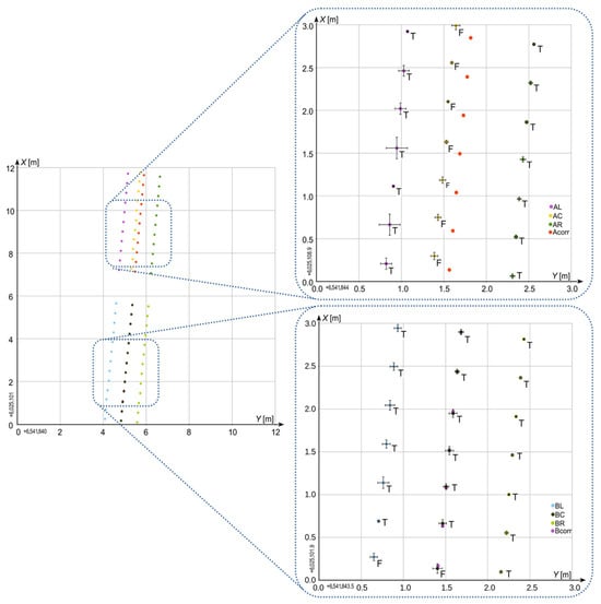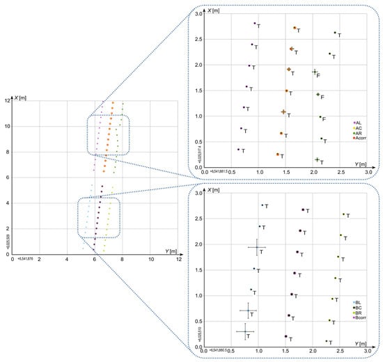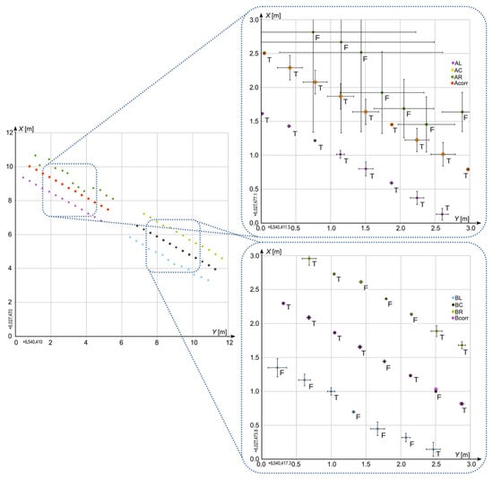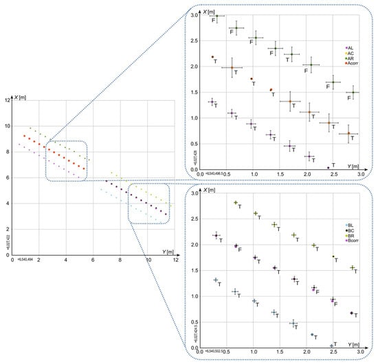 Figure 8, Figure 9, Figure 10 and Figure 11 illustrate representative examples of the measurement system’s performance under various field conditions. Each figure displays a series of consecutive measurements for all six receivers, accompanied by the corrected positions of the central receivers, Acorr and Bcorr, as computed by the algorithm. Uncertainty crosses denote the CQ2D values for individual measurements. Additionally, results classified as valid (T) and included in the corrected central-receiver calculations are distinguished from those deemed erroneous (F) and excluded from further analysis.