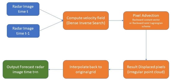 26]. First, the velocity field of the precipitation is estimated from consecutive radar images; this velocity field is then used to extrapolate the precipitation field forward in time beyond the latest observation.