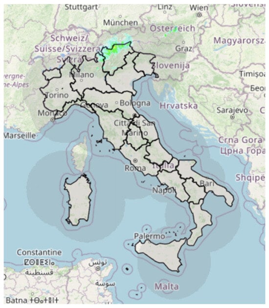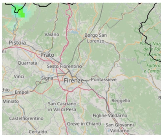 33]. The platform allows for the nationwide visualisation of both ongoing and recorded weather phenomena in the last 24 h. This is achieved through the real-time processing of raw data from the national radar network, the network of rain gauge and thermometric stations for the Regional Hydrological Service of the Tuscany Region, satellite data, and the lightning network. The production of these data involves the Italian regions, along with the DPC, through the Functional Centres Network, Enav (the National Flight Assistance Agency), and the Italian Air Force.