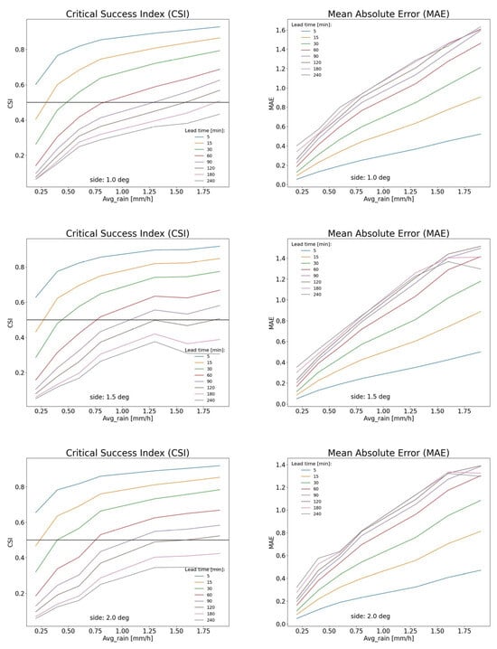 CSI (left column) and MAE (right column) as functions of average rain rate for different lead times. The 0.5 CSI threshold is indicated. From top to bottom, the pictures refer to the increasing side for the selected domain area, as indicated (1.0°, 1.5°, 2.0°).
