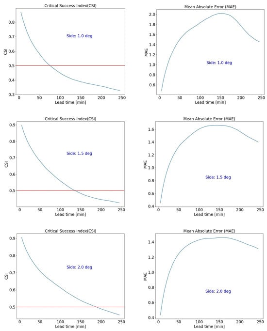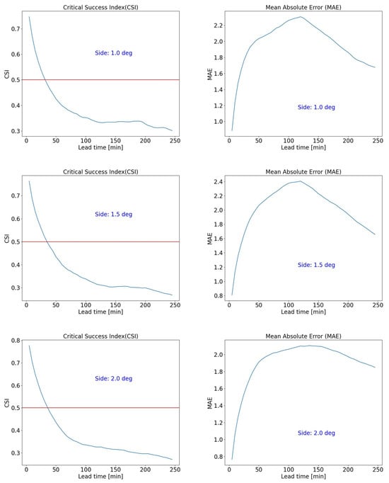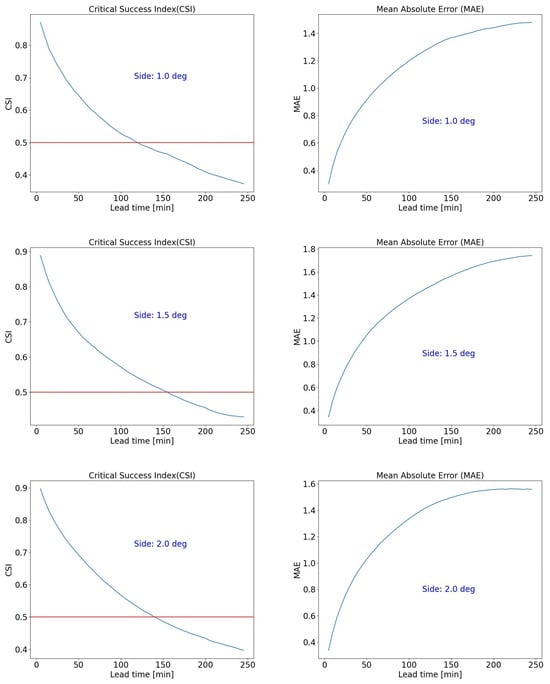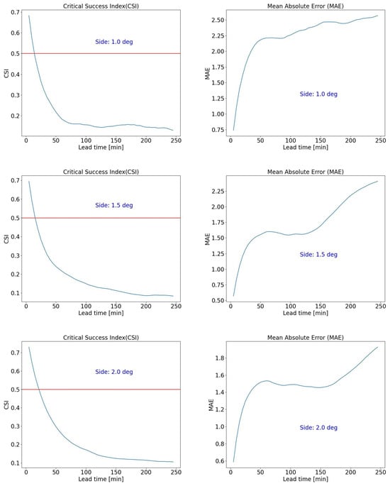 CSI (left column) and MAE (right column) as functions of lead time for a stratiform case study, 5 January 2022 11:00–6 January 2022 02:00. The 0.5 CSI threshold is indicated. From top to bottom, the increasing side of the selected domain area is also indicated (1.0°, 1.5°, 2.0°).