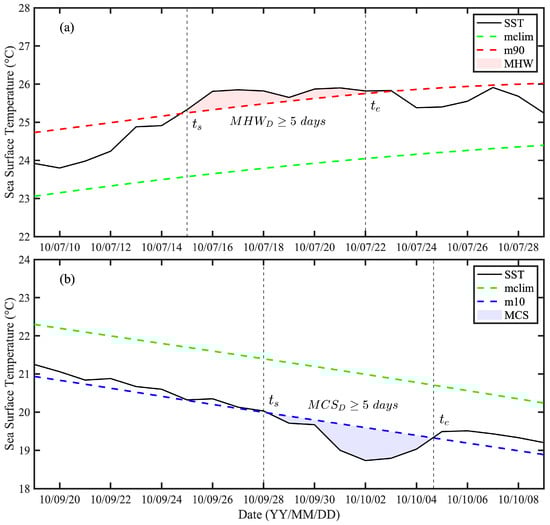 In this study, MHWs are defined as events where the daily average SST exceeds the 90th percentile of the climatic baseline (typically over a 30-year period). MCSs are defined as events where the daily average SST falls below the 10th percentile. Each event must last for at least 5 days, and to distinguish independent events, there must be a gap of at least 2 days between consecutive MHW/MCS events [3,5]. We used the detect function from the M_MHW toolbox in MATLAB R2025a to identify the characteristics of all MHW and MCS events between 2010 and 2019, following the definitions and methods outlined by Hobday et al. [5], using a fixed climatic baseline. Figure 1 presents examples of an MHW observed at 42.675°N, 36.5°W, and an MCS observed at 43.875°N, 13.625°W in 2010. The intensity of the MHW/MCS is defined as the difference between the SST (black line in Figure 1) and the climatic mean (green line in Figure 1). The daily intensity reflects the magnitude of abnormal warming (for MCSs, cooling). The cumulative intensity is given by integrating the shaded area (red for MHWs and blue for MCSs).
