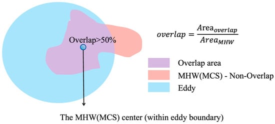 Figure 2. Schematic diagram of the overlap-based match process. The red area represents the spatial extent of MHWs or MCSs, the blue area represents the mesoscale eddy (anticyclonic or cyclonic) region, and the purple shaded area represents the overlapping region between the two. The match criterion is that the overlapping region must account for more than 50% of the total area of the MHW/MCS.