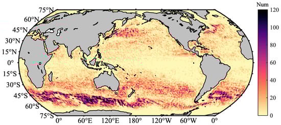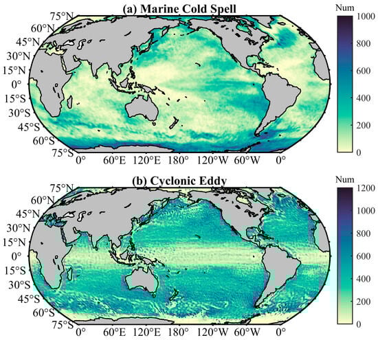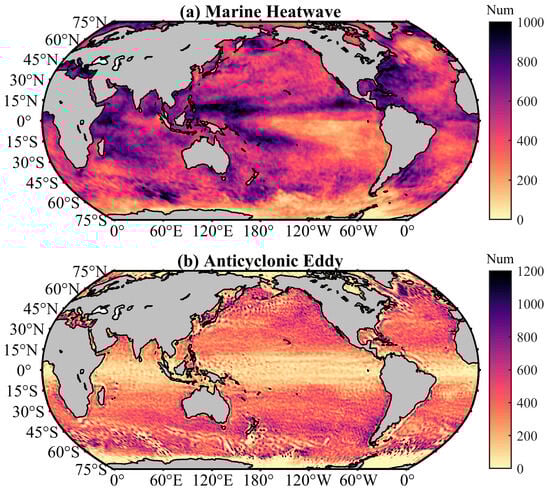 In this section, we present the spatial distribution characteristics of MHWs, MCSs, and their associated mesoscale eddies (AEs and CEs) during the period from 2010 to 2019. The location of each MHW, MCS, and mesoscale eddy is determined by the central position and the boundary contour of the event. These locations are then gridded with a 1° by 1° spatial resolution to perform the spatial distribution analysis. Each event’s centroid is assigned to a specific grid cell, and the distribution is statistically processed by counting the number of occurrences of MHWs, MCSs, and eddies in each grid cell. This approach allows for the visualization of the global spatial distribution of MHWs, MCSs, and their associated eddies. Figure 3 and Figure 4 show the occurrence counts of MHWs/MCSs and AEs/CEs, respectively.