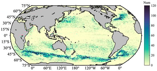 From Figure 5, it is evident that the distribution characteristics of the matched MHWs exhibit significant spatial heterogeneity. First, the GS and KE regions in the Northern Hemisphere (located approximately at 30°N, 80°W and 30°N, 140°E) show concentrated high-frequency MHW zones, with higher counts of MHWs in these areas. Additionally, the mid- to high-latitude regions of the Southern Hemisphere (located between approximately 50°S, 60°E to 90°E in the South Indian Ocean and around 50°S, 60°W in the South Atlantic Ocean, particularly near the southern coast of Australia) exhibit significantly higher counts of MHWs.