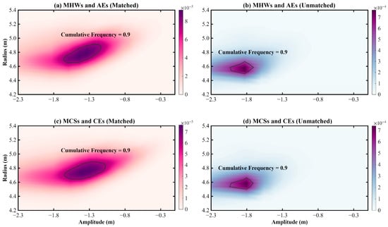 Figure 7. Probability density distributions of the amplitude and radius for AEs associated with MHWs (a) and CEs associated with MCSs (c) as matched by the 2.4 criterion, as well as for unmatched AEs (b) and unmatched CEs (d) for MHWs and MCSs, respectively. The x-axis represents the logarithmic value of the eddy amplitude, and the y-axis represents the logarithmic value of the eddy radius. Both amplitude and radius are measured in meters (m). The color shading in each subplot indicates the frequency of occurrence for different combinations of amplitude and radius. A black closed contour line represents the 0.90 cumulative density level.