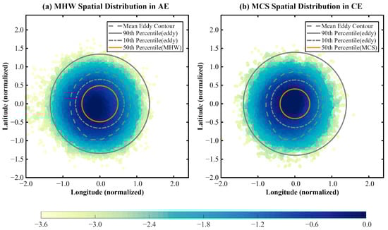 Figure 8. Normalized probability density spatial distribution of (a) MHW events within AEs and (b) MCS events within CEs across all study years. The x- and y-axes represent the normalized longitude and latitude relative to the center of the eddy, respectively. The color shading indicates the probability density of MHW and MCS events, with darker regions representing higher probability densities, indicating a more concentrated distribution of the respective events, and lighter regions representing lower probability densities. The probability density is shown on a log10 scale. The gray contour lines depict the contours of mesoscale eddies, with the AE contour on the left for MHW and the CE contour on the right for MCS. The gray dashed line represents the 90th percentile boundary contour, the gray dash-dot line represents the 10th percentile boundary contour, and the gray solid line represents the average eddy contour. Additionally, the orange-red contour line represents the 50th percentile of MHW events, indicating that 50% of the MHW events fall within this boundary.